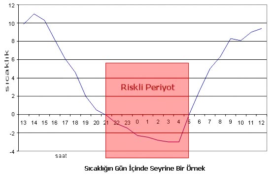 Sıcaklığın en düşük olduğu saatler sabaha yakın saatler olup genellikle gündoğumundan hemen önce pik değere ulaşmaktadır.
